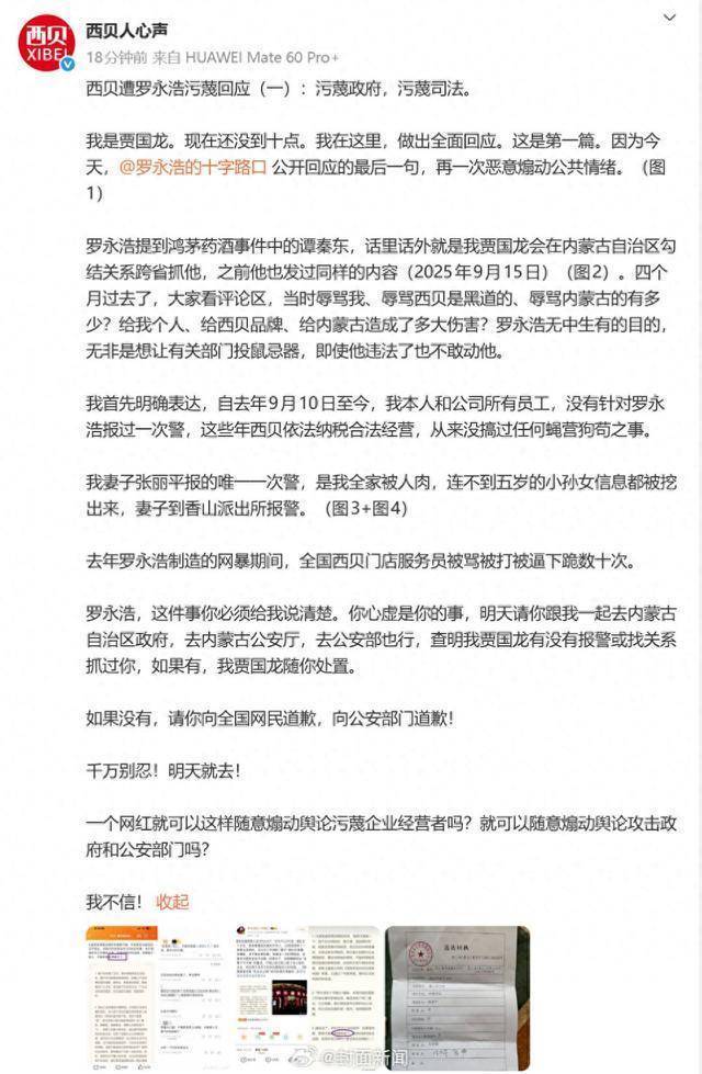 1月16日晚,贾国龙通过@西贝东说念主心声 发文:“自旧年9月10日于今,我本东说念主和公司总计职工,莫得针对罗永浩报过一次警,这些年西贝照章征税正当权术,从来没搞过任何蝇营狗苟之事。我妻子张丽平报的独逐个次警,是我全家被东说念主肉,连不到五岁的小孙女信息齐被挖出来,妻子到香山派出所报警。”