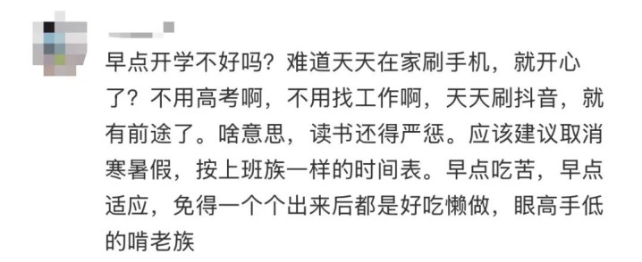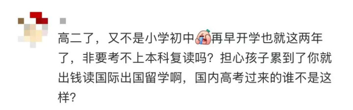 对于“提前返校”的话题,家长们的不雅点也南北极分化。部分家长认为,升学压力大,提前返校无可厚非,总比在家天天刷手机强——