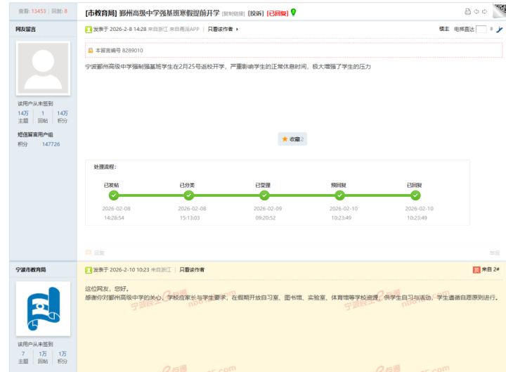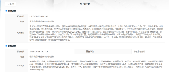 早在春节前,就有宁波网友在民生e点通留言,吐槽当地某中学让强基班学生2月25日返校,认为此举打乱学生浩繁休息节律,大幅增多学业压力。