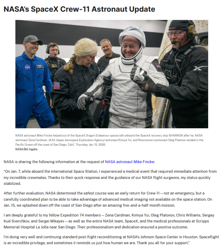 IT之家2月26日音问,宇航员迈克・芬克当天在NASA官网发表声明,回复了本年1月因健康问题提前返程的情况。