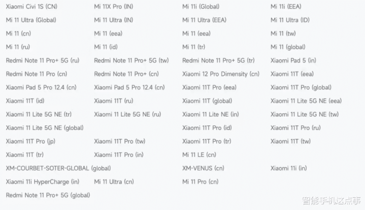 平板家具线也有一些,分裂是Xiaomi Pad 5(印度版)、Xiaomi Pad 5 Pro 12.4(国行);还有一些机型像小米11i、11i HyperCharge、Redmi Note 11系列的其他生息版也在名单中。