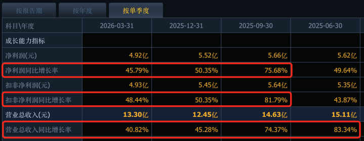 在AI算力需求井喷的2025年,天孚通讯凭借为群众AI算力巨头提供光器件居品,功绩亮眼,增长势头延续到了2026年第一季度。阐发最新数据,第一季度公司闭幕营业收入13.3亿元,同比增长40.82%;闭幕包摄于上市公司股东的净利润4.92亿元,同比增长45.79%。