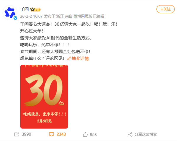 按狡计,千问30亿元春节宴客狡计将于2月6日崇拜上线,步履技巧不仅包含大齐免单职权,还将披发高额现款红包。
