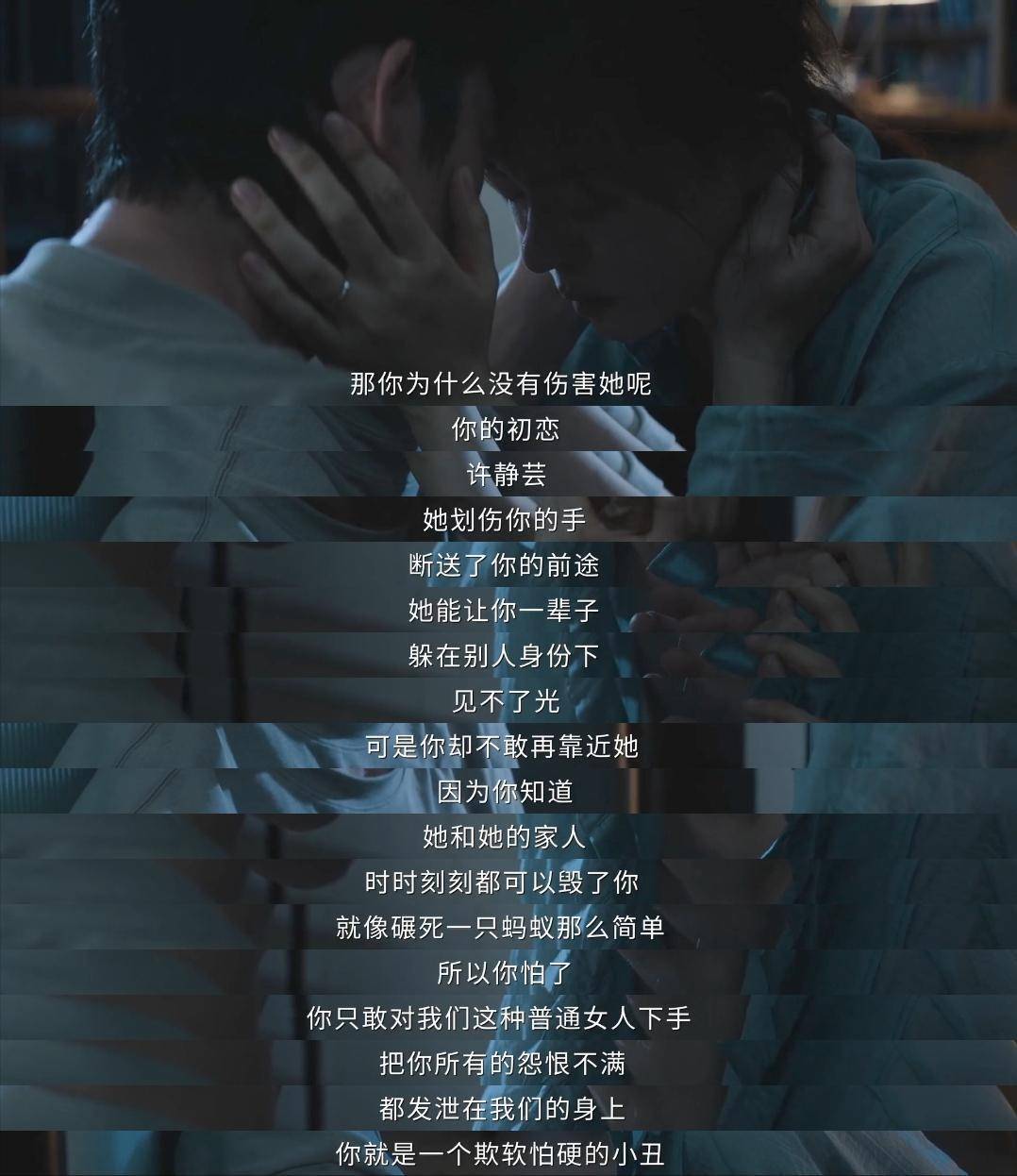 比如说,罗梁用小白鼠给颜聆制造煤气灯效应,颜聆就拿笔筒这个凶器,让罗梁心生懦弱。
