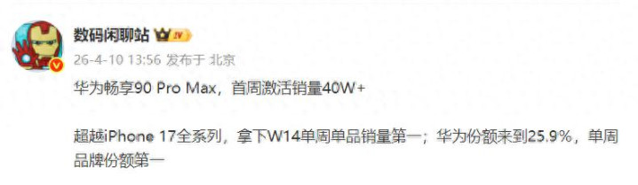 华为能在W14周推崇如斯拉风,最主要即是收货于华为畅享90系列的开售,很是是华为畅享90 Pro Max这款机型,它不错用卖爆了来刻画。行业东谈主士“数码漫谈站”暗示:华为畅享90 Pro Max首周的激活量就达到40万台傍边,举座销量是卓越本周iPhone 17全系系列的。恰是凭借这个推崇华为畅享90 Pro成为W14周国内单品销量第一的机型,华为也靠着这款机型W14周份额高达25.9%,周排行第一,远远最初友商。这一周友商份额最高的也莫得高出16%。为了进一步让环球信服,他又在互动区晒出了iPhone 17系列的相干数据。他暗示:W14是3.30-4.5,时分iPhone 17 Pro Max单周销量24.6W,iPhone 17 Pro单周22.3W,九游会iPhone 17单周14.3;华为Mate80单品第五,畅享90 Plus单品第六,单周激活9.5W。