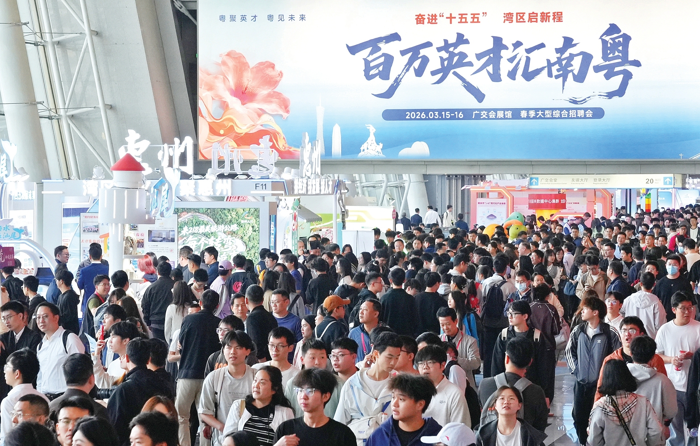 上昼8时许,广州广交会展馆已是东说念主头攒动,来自五湖四海的后生学子有序列队插足招聘会场,“热忱迎接有志后生,处事创业选拔广东”“百万英才汇南粤,南粤视君为张含韵”等揽才口号,也止境引东说念主选藏。