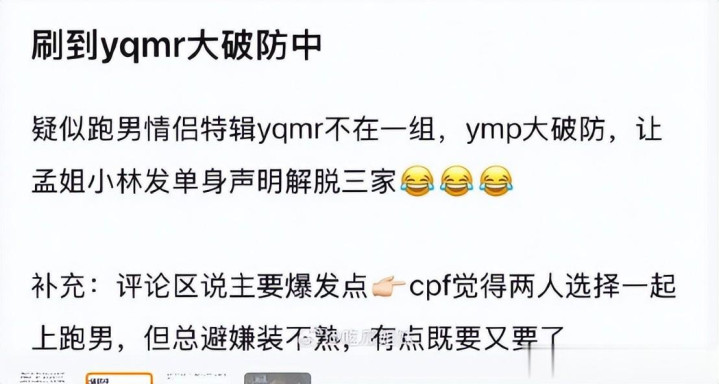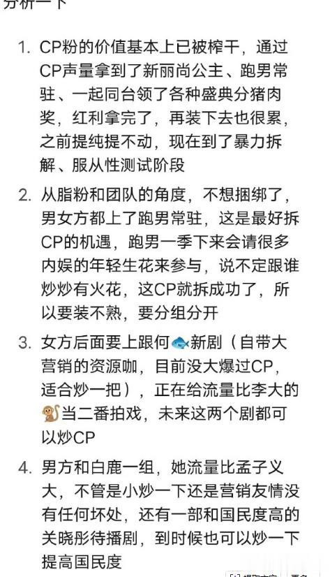 一个是从团队的角度磋议,不像绑缚了,男女王人上了跑男常驻,这是最佳拆CP的契机。